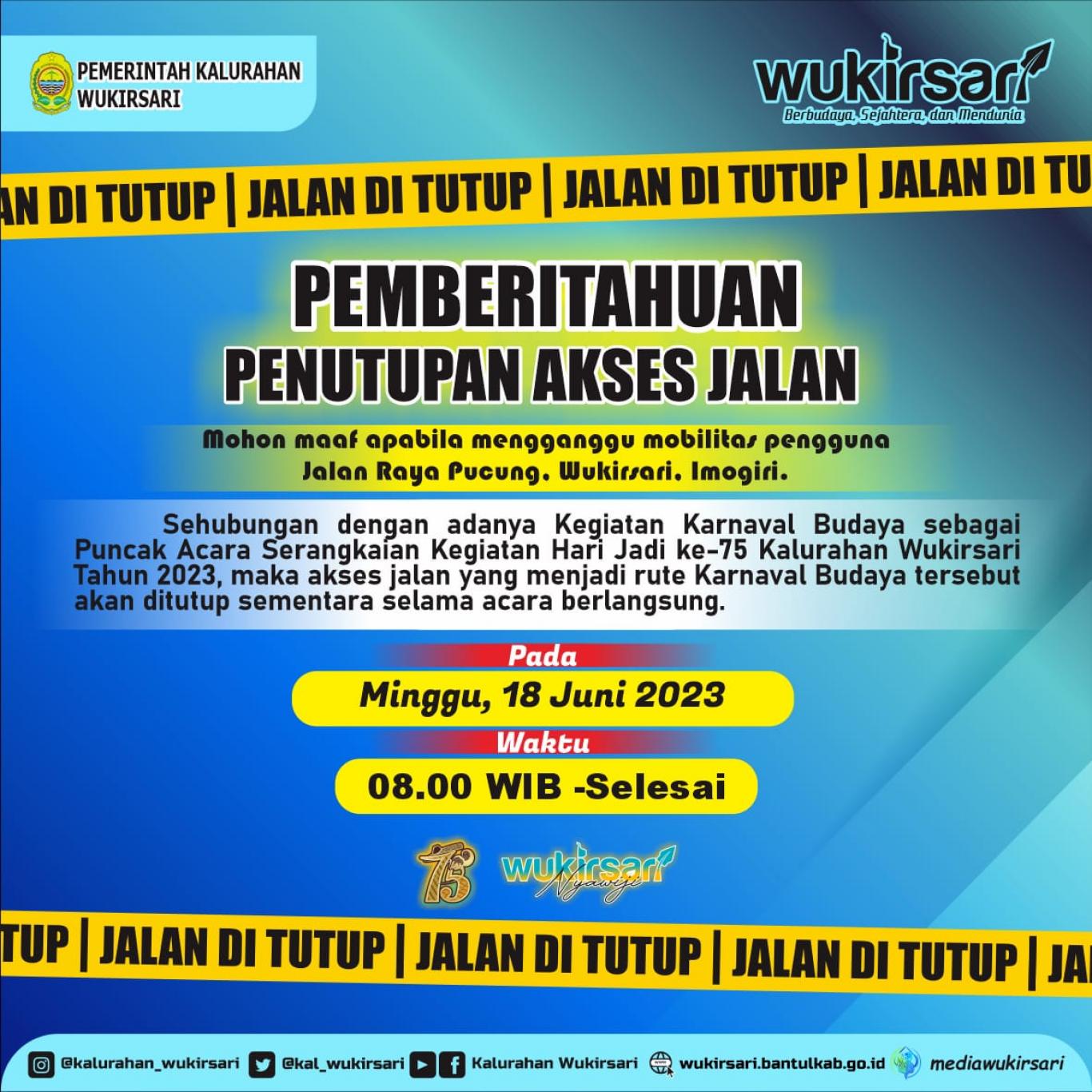 Sehubungan dengan adanya Kegiatan Karnaval Budaya sebagai Puncak Acara Serangkaian Kegiatan Hari Jadi ke-75 Kalurahan Wukirsari Tahun 2023 yang diselenggarakan pada hari Minggu, 18 Juni 2023 pukul 08.00-12.00 WIB dengan start di Lapangan SD N Pucung dan finish di Komplek Kantor Kalurahan Wukirsari, maka akses Jalan Raya Pucung, Wukirsari, Imogiri yang menjadi rute Karnaval Budaya tersebut akan ditutup sementara selama acara berlangsung.