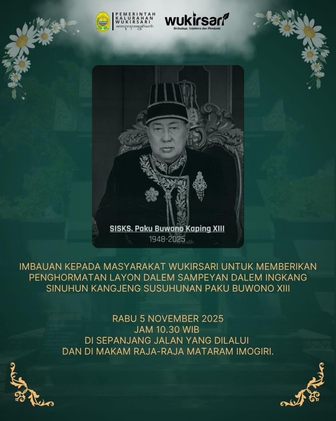Pemerintah Kalurahan Wukirsari menyampaikan imbauan kepada masyarakat Wukirsari untuk memberikan penghormatan kepada Layon Dalem Sinuhun Kanjeng Susuhunan Paku Buwono XIII.