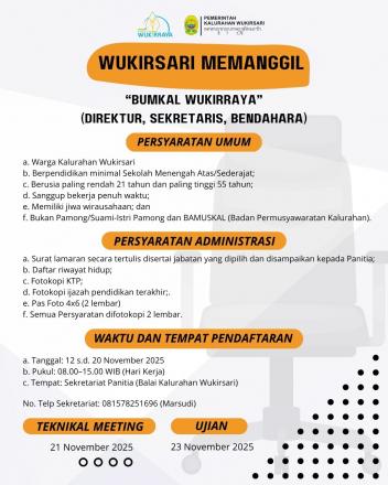 Kalurahan Wukirsari membuka kesempatan bagi warga terbaik untuk bergabung dan berkontribusi dalam pengelolaan Badan Usaha Milik Kalurahan (BUMKal) Wukirraya ?
