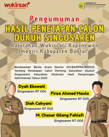 Pengumuman Hasil Penetapan Calon Dukuh Singosaren resmi dirilis oleh Kalurahan Wukirsari. Berdasarkan Berita Acara Nomor 001.BA/PPPK/XI/2025, berikut nama-nama calon yang telah lolos penyaringan administrasi tahun 2025: