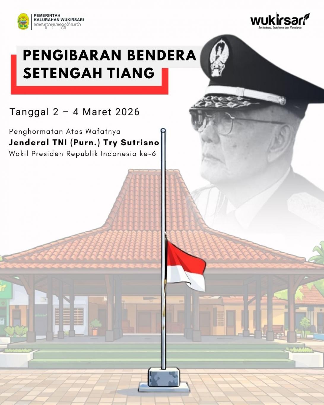 Menindaklanjuti surat edaran dari Menteri Sekretaris Negara Republik Indonesia, Pemerintah Kalurahan Wukirsari melaksanakan pengibaran Bendera Merah Putih setengah tiang selama 3 (tiga) hari berturut-turut, mulai tanggal 2 s.d. 4 Maret 2026.