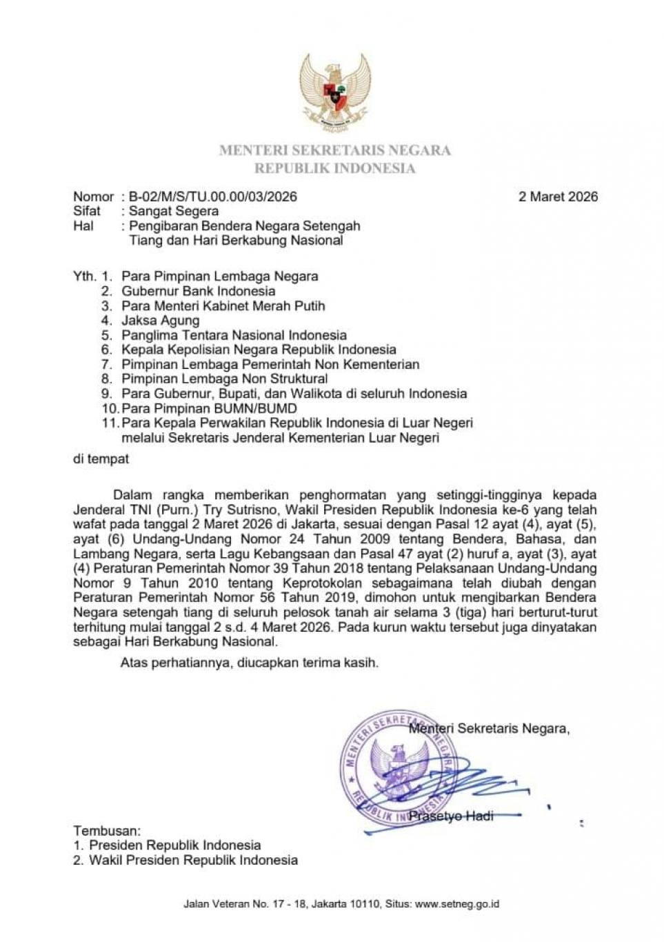 - Pengibaran setengah tiang ini sebagai bentuk penghormatan atas wafatnya Wakil Presiden RI Ke-6