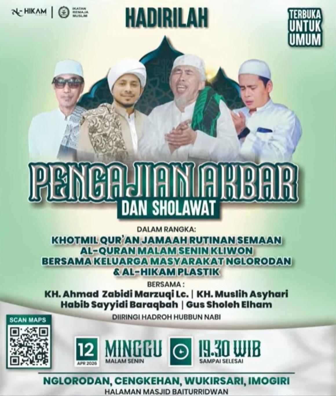 PENGAJIAN AKBAR & SHOLAWAT Dalam Rangka Khotmil Quran Jamaah Rutinan Semaan Al Quran Malam Senin Kliwon Bersama Keluarga Masyarakat Nglorodan & Al Hikmah Plastik Bersama KH. Ahmad Zabidi Marzuqi Lc - KH. Muslih Asyhari - Habib Sayyidi Baraqbah - Gus Sholeh Elham Minggu, 12 April 2026 Halaman Madjid Baiturridwan, Nglorodan, Cengkehan, Wukirsari, Imogiri, Bantul