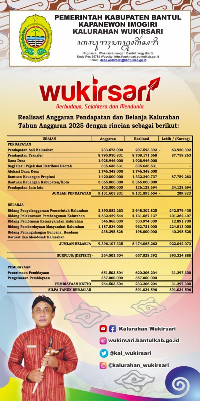 Pemerintah Kalurahan Wukirsari menyampaikan realisasi Anggaran Pendapatan dan Belanja Kalurahan (APBKal) Tahun 2025 sebagai bentuk keterbukaan informasi kepada masyarakat. Melalui laporan ini, kami berkomitmen untuk terus menjaga akuntabilitas, transparansi, dan pelayanan terbaik bagi masyarakat.